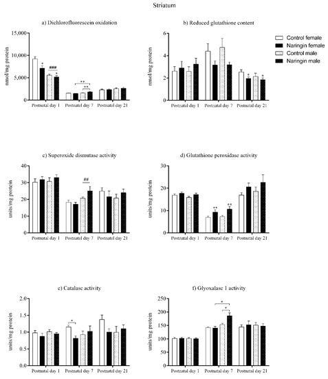 On postnatal day 1, the offspring born to naringin supplemented rats showed reduced total oxidants content (supplementation effect, p < 0.001) in the striatum (Figure 3a), even though no other supplementation-related alterations in the redox status were found at this postnatal age (Figure 3). Such alteration was also accompanied by a sex-associated difference in which females demonstrated higher oxidants content compared to males (sex effect, p = 0.007) also on postnatal day 1 (Figure 3a).