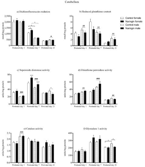Effects of maternal naringin supplementation during the third week of gestation on the (a) dichlorofluorescein oxidation, (b) reduced glutathione content, (c) superoxide dismutase activity, (d) glutathione-peroxidase activity, (e) catalase activity, and (f) glyoxalase 1 activity in the offspring’s cerebellum on postnatal days 1, 7, and 21. Results are expressed as mean ± S.E.M. Control female n = 8, naringin female n = 8, control male n = 8, naringin male n = 6. * p < 0.05; *** p < 0.001 # p < 0.05; ## p < 0.01; ### p < 0.001 (two-way ANOVA). Asterisks represent a main supplementation effect, and the hashes on bars represent a main sex effect. The asterisks on bars (single bracket) represent the significant comparisons by Sidak’s post-hoc test when interactions occurred.