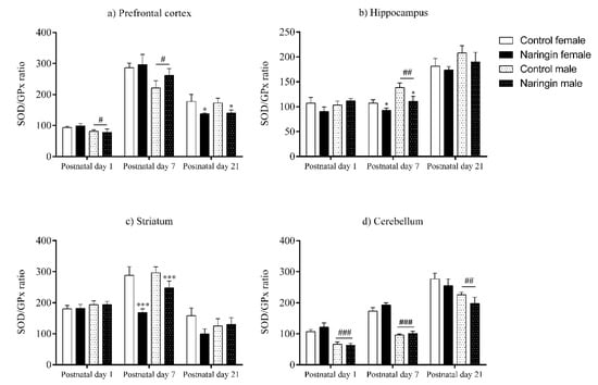 Effects of maternal naringin supplementation during the third week of gestation on the SOD/GPx ratio in the offspring’s (a) prefrontal cortex, (b) hippocampus, (c) striatum, and (d) cerebellum on postnatal days 1, 7, and 21. Results are expressed as mean ± S.E.M. Control female n = 8, naringin female n = 8, control male n = 8, naringin male n = 6. * p < 0.05; *** p < 0.001 # p < 0.05; ## p < 0.01; ### p < 0.001 (two-way ANOVA). Asterisks represent a main supplementation effect, and the hashes on bars represent a main sex effect. The asterisks on bars (single bracket) represent the significant comparisons by Sidak’s post-hoc test when interactions occurred.