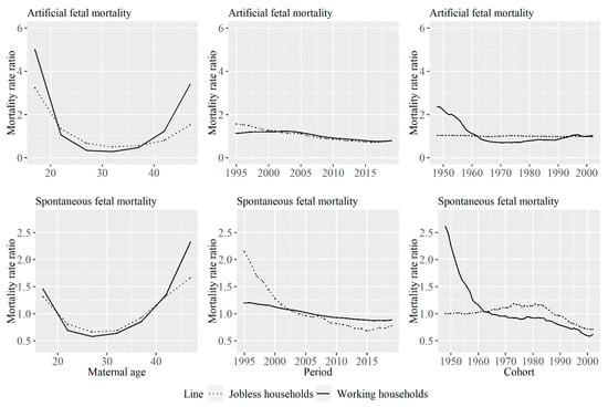 The difference in the maternal age-standardized rate of both the artificial and spontaneous fetal mortality rates between the two types of households decreased in the analyzed periods. However, there was a statistically significant difference in the rate ratio of jobless households compared with working households, regardless of maternal ages, periods, and cohorts for the artificial fetal mortality rate. A statistically significant difference was also observed for the spontaneous fetal mortality rates in some ages, periods, and cohorts. Trends of birth cohort effects were particularly different between the two types of households for both the artificial and spontaneous fetal mortality rates. A large decrease of the cohort effect was observed from cohorts born in the late 1940s to the 1970s in working households, whereas it was not observed in jobless households. Further studies investigating the physical and socioeconomic characteristics of pregnant women for both jobless and working households are required for a better understanding of the reason for the disparity.