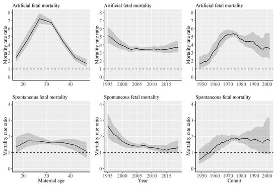 Figure 2 shows the rate ratios of jobless households compared with working households for the artificial and spontaneous fetal mortality rate. It was shown that the degree of the disparity changed depending on maternal ages, periods, and cohorts. There was a statistically significant difference between the two types of households in all ages, periods, and cohorts for the artificial fetal mortality rate. The artificial fetal mortality rate ratio became the largest among the group aged 25–29 years old. Moreover, although the rate ratio increased until cohorts born in the 1970s, it showed a decreasing trend thereafter. Regarding the spontaneous fetal mortality rate, estimates of the rate ratio were above 1 in many of the cases. A statistically significant difference between the type of households was observed in some of the ages, periods, and cohorts. The rate ratio showed a decreasing trend with an increase in age for spontaneous fetal mortality rate. Although the spontaneous fetal mortality rate ratio showed a decreasing trend during the analyzed period, it showed an increasing trend from cohorts born in the late 1940s to the 1970s.