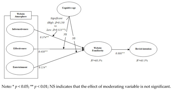 Subsequently, it was determined if the path coefficients were different between the subgroups by imposing equality constraints on the path coefficients [106]. Table 5 illustrates the results of the moderating function of travelers’ cognitive age on the effects of the three subdimensions of travel website atmosphere on website familiarity. In the relationship between informativeness and website familiarity, the chi-square difference test showed that the free model and constraint model imposed on the path coefficients were significantly different at the 0.05 level (Δχ2 = 13.378 > χ2 0.05(1) = 3.84, df = 1). Specifically, in the group with low-cognitive age, the effect of informativeness on website familiarity was stronger than in the group with high-cognitive age (low: β = 0.515, t-value = 5.840, p < 0.05 vs. high: β = 0.150, t-value = 1.570, p = 0.116). Thus, hypothesis 5a was supported. However, there were no significant differences at the 0.05 level between the free model and constraint model in the relationships between effectiveness and website familiarity (Δχ2 = 2.007 < χ2 0.051) = 3.84, df = 1), as well as entertainment and website familiarity (Δχ2 = 0.015 < χ2 0.05 (1) = 3.84, df = 1). Therefore, hypothesis 5b and hypothesis 5c were not supported.