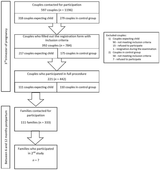 Couples expecting their first child were contacted via antenatal schools in the Pomeranian area and social media. Non-expectant couples were recruited via announcements at the University of Gdansk and social media. In order to be included, all participants had to be in the age range 22–35 years. Only couples with a relationship lasting at least 2 years and with previous cohabitation could participate. Exclusion criteria for both partners were tobacco consumption, drug use, pharmacological treatment such as glucocorticosteroids or selective serotonin reuptake inhibitors, alcohol and psychoactive substance addiction. All participants had to declare general good health. The two groups (expectant vs. non-expectant) should not have significantly differed from each other on sociodemographic characteristics. Additionally, the inclusion criteria for the postpartum session were participation of the whole family (both parents and their first child), age of the infant between 6 and 12 months and absence of developmental disorder diagnosis. The recruitment process is presented in