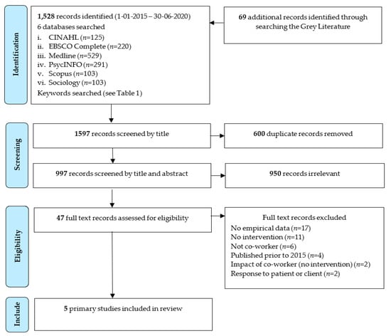 A total of 1528 studies were located during the peer-review database search, with an additional 69 grey literature records retrieved. After removal of 600 duplicates, 997 records were screened based on title and abstract, resulting in a further 950 records being excluded. Reasons for exclusion at this stage of the screening process included: no empirical data (n = 17); no intervention (n = 11); not co-worker (n = 6); published prior to 2015 (n = 4); study examined the impact of CIs on co-workers, not an intervention (n = 2); and response to patient or client (n = 2). Following the full-text review, five records met the eligibility criteria and were included (see Figure 1 PRISMA flow chart). All included studies were subject to quality assessment.