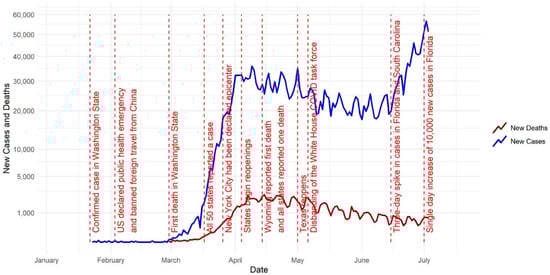 Figure 1), we delve into some significant milestones that occurred in the United States in 2020 and further mapped COVID-19 cases and deaths (