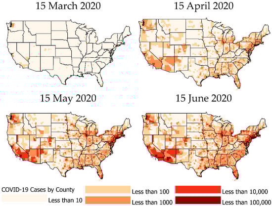 Figure 2 shows the number of cumulative COVID-19 cases per county on 15 May 2020. By mid-June, Florida and South Carolina were both recording a three-day long spike in cases. Later, on 2 July, Florida reported a single day increase of 10,000 new cases, and by 8 July, hospitals in both Florida and Arizona began to reach capacity due to their COVID-19 case load [