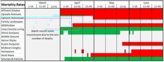GenXUrban became a high-risk LifeMode in late March but went back to inconclusive in early June. The households in this LifeMode are generally 38–47 years old, married, living in single family housing, are predominantly white, and make USD 47,000–68,000 annually. They own older single-family homes in urban areas, live and work in the same county, enjoy going to museums and rock concerts, dining out, and walking for exercise.