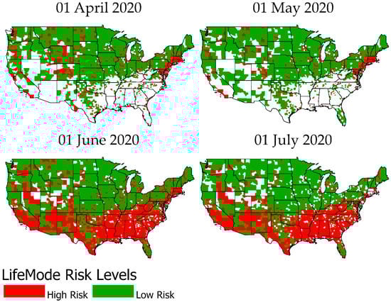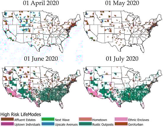 Figure 6 shows the shift from no outbreak to low risk to high risk LifeModes quickly spreading and covering the coastal and southern counties of the nation from the beginning of the outbreak in March to July.