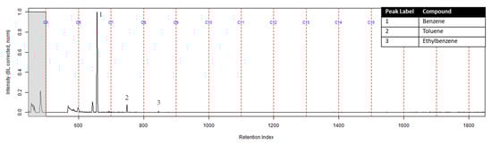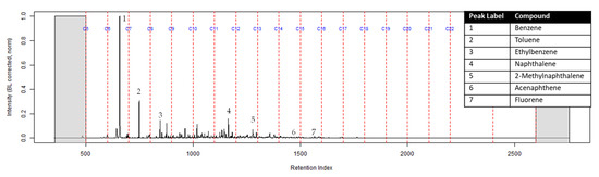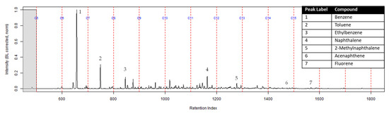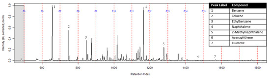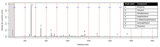 Compound identification was focused on seven major compounds from Table 1 in the previous section: benzene, toluene, ethylbenzene, naphthalene, 2-methylnaphthalene, acenaphthene, and fluorene. The following figures are normalized to the most intense peak of the TIC.