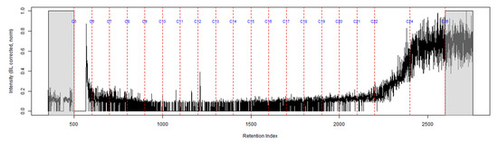 In Equation (2), [T] is the transformation matrix used to produce a meaningful oblique rotation of and the error contribution, [E], has been dropped. It is generally not possible and not required to find the entire transformation matrix, [T]. Instead, it suffices to find acceptable test factors (vectors) one at a time. In Equation (3), is a transformation vector for the lth row of , and is the spectrum vector of one of the 295 target compounds in the NCFS library which meets the RI proximity requirement. In Equation (3), is the inverse of which is composed of an orthonormal set of vectors. Equation (4) then calculates from and a comparison of the two vectors determines if the vector projected into the abstract factor space lies within the space defined by the principal factors. The comparison of and was made by calculating the Pearson product moment correlation. A Pearson correlation of 0.99 or greater was required to identify a compound corresponding to as contributing to the chromatographic peak.