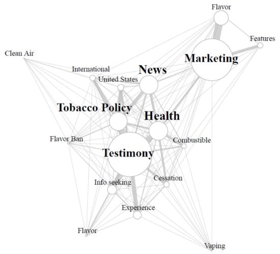 Two independent coders coded the first 1000 tweets using the binary system for each category and sub-category (“1” if a specified description was present and “0” if a specified description was absent). The inter-rater reliability (IRR) for all themes and subthemes was calculated after the initial coding; initial IRRs ranged from 72% to 98%. Following previous qualitative content analysis best practices [], theme and subtheme differences were discussed and coding definitions amended until consensus between the two coders was reached, and the remaining tweets were coded with the final IRR for all categories > 87%. After the coding process was completed, we conducted a descriptive analysis of the categorized tweets and a pairwise co-occurrence analysis to evaluate connections across themes and subthemes (e.g., the proportion of tweets describing personal testimonies that have health claims about IQOS) as well as between the main themes and their corresponding subthemes (e.g., the proportion of marketing tweets that described flavors) to provide a more nuanced content analysis. Co-occurrence analyses were run in R using the tnet packages to construct the co-occurrence matrix and the igraph package to visualize the results. All posts in this dataset were publicly available and anonymized, and all analyses adhered to the terms and conditions, terms of use, and privacy policies of Twitter, and were performed under University of Southern California Institutional Review Board approval. To further protect privacy, posts exemplifying themes are paraphrased; no tweets are reported verbatim in this report.