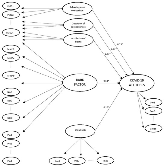 Bifactor model for predicting attitudes toward COVID-19. * p < 0.05. Standardized total effects.