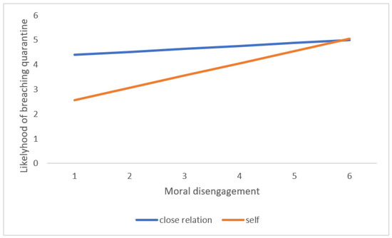 Nevertheless, a very relevant main effect for the protagonist IV was found for the decision to breach quarantine. Participants were much more willing to break the rules for the benefit of a loved one than for themselves. As Cadsby et al. [19] state, breaching health rules is a transgression nevertheless, but when it benefits a loved one, individuals have a moral alibi that helps them perceive they are not acting selfishly—or that they are even acting altruistically, giving the proper advice, or making a sacrifice for the other person. It may even increase the sense of power in the individual through the perception of being a person with initiative and determination, as van Kleef et al. [20] suggests regarding rule violations that benefit others. In addition, results show an interaction effect between the vignette character and moral disengagement that supports Hypothesis 5. All participants showed a high level of non-compliance when the protagonist was a close relation, irrespective of their score in moral disengagement. However, while participants with low moral disengagement scores on average indicated a low probability of breaking the quarantine when they were the characters in the vignette, individuals with a high level of moral disengagement stated that they would probably break it irrespective of who was the protagonist. This indicates that most people low in moral disengagement tend to commit more transgressions for the benefit of a close relation rather than for personal gain. This likely happens because it is easier to justify internally and externally a transgression that may be construed as “altruistic.” However, individuals who show a high level of moral disengagement have an easier time justifying a selfish act and choose to pursue their own benefit as often as when they can justify a “prosocial” transgression. They are more used to cognitive strategies that mitigate the aversive feelings of committing a transgression and break rules, regardless of whether it benefits them or a close relation without the need for further motivations.