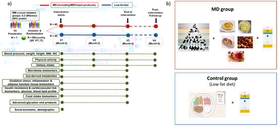 - The low-fat diet (control diet) consists of a restricted consumption of fats. This diet will be based on the one proposed as low-fat diet in the PREDIMED study [], and it will provide 55% of energy from carbohydrate, 25–30% from fat, and 15–20% from protein. The low-fat diet is the most used diet for obesity treatment in adolescents []. This group will not receive any additional specific food by the researchers.