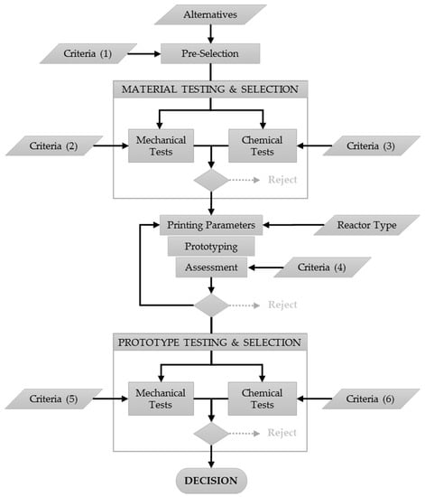 The process proposed for determining a suitable material satisfying both chemical and mechanical requirements is illustrated in Figure 1. The diagram shows multiple criteria in several steps.