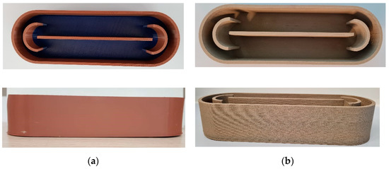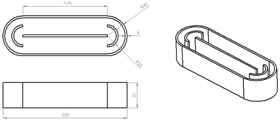 Hence, the selected materials, PLA and Timberfill®, were used to 3D print lab-scale raceway ponds. According to the literature [68,69,70,71], the capacity of the prototype reactor was fixed at 0.5 L. A height of 51.0 mm was adopted assuming 50 mm for the optical path. The ratio length/width was set to 3, according to previous studies [47,69] recommending a value in the range 3–6. This led to a length of 250.0 mm and a width of 80.0 mm. Figure 3 gives the corresponding scheme.