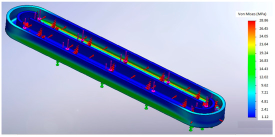 Given the geometry of the reactor (RPR), materials need to be next assessed regarding the load they will bear while operating. This will be assessed by the minimum material thickness tolerating the maximum stress attained at any point of the reactor (Criterion 4.1). Certainly, sophisticated designs with variable thickness can be envisaged, but constant thickness is accepted as a reasonable condition to continue with the process of material selection. Hence, a Flexural test is proposed to evaluate the maximum stress resisted by the (pieces) materials, while the von Mises stress obtained using Finite Element Method (FEM) analysis is proposed to estimate the maximum stress in the reactor. The Flexural test was performed following the ASTM D6272 [72] standard. Five rectangular samples of each material (PLA and Timberfill®) were printed (Figure 4) using a Sigma printer by BCN3D (Barcelona, Spain).