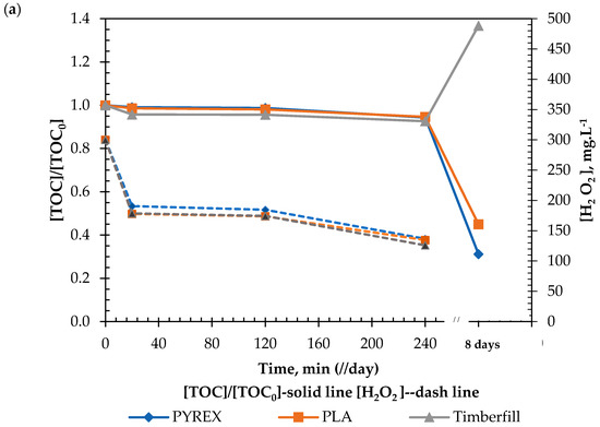 The experiments were repeated without light and under UV irradiation. These repetitions are consistent and show the parallel response of Fenton and photo-Fenton processes, although the presence of UV light speeds up the oxidation of the organic matter, as expected. In the short term (i.e., 240 min), PLA and Timberfill® perform very similarly without light, although under UV light, Timberfill® performs less efficiently than PLA. Thus, both can handle Fenton and photo-Fenton reactions (Criterion 6.1), but the lower efficiency of Timberfill® indicates the interference of the material in the reaction and suggests the migration of organic matter from the material to the solution (Criterion 6.2). The PLA profile running quite parallel to the Pyrex® profile also supports this idea, which is confirmed in the long term. After 8 days for the Fenton reaction and after only 2 days for the photo-Fenton reaction (faster, as expected) Timberfill® is revealed as completely unsuitable in both cases due to the evident interaction of the material with the processes.