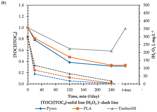 Evolution of TOC and concentration (a) without UV and (b) with UV irradiation (30 ± 0.5 mg caffeine solutions, = 17.2 ± 1 mg in PLA, Timberfill®, and Pyrex® reactors. Experimental conditions: pH = 3 ± 0.2, = 300 ± 10 mg .