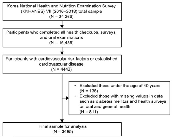 A total of 16,489 out of 24,269 participants from the KNHANES VII completed all health checkups and surveys, including oral examinations. From these, we identified 4442 individuals with two major cardiovascular risk factors (hypertension and dyslipidemia) or established CVD (stroke, myocardial infarction, and angina pectoris). We included people with hypertension and dyslipidemia because these are two major contributing risk factors of CVD and because of the additive adverse impact on the vascular endothelium which results in enhanced atherosclerosis, leading to CVD a few years later [28]. We excluded 811 participants with missing data such as DM values and health surveys on oral and general health. We also excluded 136 individuals under the age of 40 because mortality and prevalence of cardiovascular risk factors such as obesity, hypertension, diabetes mellitus, and dyslipidemia are known to increase more rapidly among individuals over 40 or those who are middle-aged or more [29,30]. Finally, we used data from 3495 participants for the analysis (Figure 1).