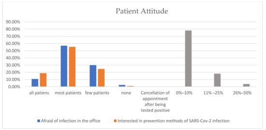 Another noteworthy result of our survey, also confirmed by previous studies [,], is that more than half of the patients (57%) visiting dental offices after the outbreak of the pandemic showed concern regarding the possibility of cross-contamination in dental settings, while 55.4% inquired about the prevention measures undertaken by the dental office. Patient appointment cancellation due to SARS-CoV-2 contamination was estimated to 0%–10% in 78% of the assessed dental offices, and patient volumes were lower in 2020 than in 2019.