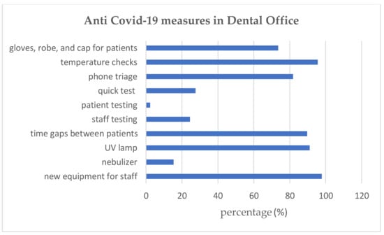 When assessing the implementation of national and international COVID-19 guidelines for dental practice, we found that 97.83% of the surveyed dental offices implemented protective equipment for doctors [] (PPE), 82.05% patient triage, 89.74% proper time gaps between patients, and 95.66% patient temperature checks. In line with international literature, this study also provides evidence for the effectiveness of PPE as an essential regulation for preventing the spread of the virus to and from healthcare providers and patients [,,]. Enhanced protective equipment for dental practitioners, patient phone triage, allowing regular time gaps between patients are thus considered to be more efficient than gloves, caps, and robes for patients.
