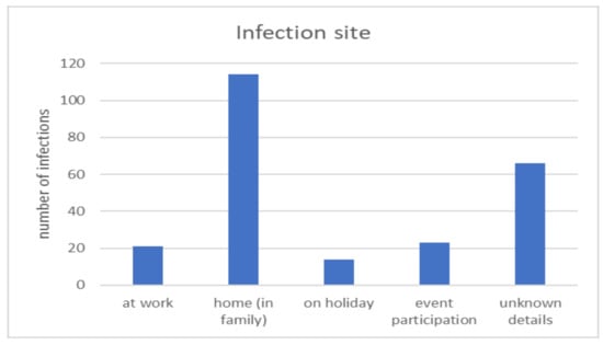 An assessment of the contamination rate among dental practitioners is indicated in Figure 4. High contamination rates were registered in October 2020 (48, 20.1%), November 2020 (66, 27.7%) and December 2020 (52, 21.85%) (Figure 4a). The SARS-CoV-2 infection rate among dental practitioners is similar to the “second wave” infection rate for the general population group (Figure 4b). Reported data on infected employees working in the assessed dental offices indicates that 117 (49.2%) were doctors, 91 (38.2%) nurses, 5 (2.1%) technicians, 4 (1.7%) managers, and 21 (8.8%) auxiliary staff (Figure 5). In most of the cases, contamination occurred at home (114 cases, 47.8%) or resulted from events attendance (23 cases, 9.6%) (Figure 6). In the case of 13 (2.56%) dental offices, 21 (8.82%) “infections at work” were declared. For 61 (25.6%) infections, no information on the source of contamination was indicated.