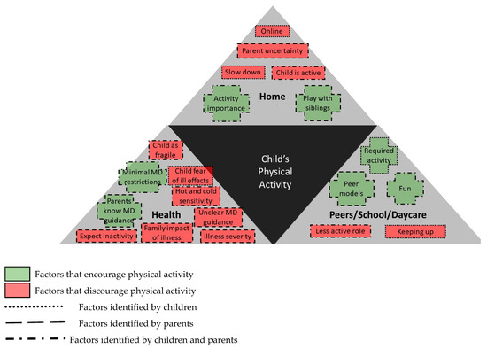 The home environment was interpreted as both encouraging and discouraging children’s physical activity. Children and parents recognized the importance of activity for heart health and thought they had achieved a physically active lifestyle despite objective measures indicating only 28% achieved the recommended 60 min per day [35]. Siblings were perceived as having a positive impact (e.g., Mom5 indicated her child with CCHD had always been very cautious but became much more active when playing with his younger brother). The children’s participation in a variety of home-based activities (e.g., soccer, swimming, biking) was described by parents and children (Boy11: I sometimes go rollerblading and I scooter and I swim sometimes). The physical home environment was also important. Having opportunities for active play interactions at or close to home definitely seemed to encourage more activity, in both summer and winter: