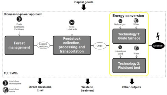 - da Costa, T.P.; Quinteiro, P.; Tarelho, L.A.C.; Arroja, L.; Dias, A.C. Environmental impacts of forest biomass-to-energy conversion technologies: Grate furnace vs. fluidised bed furnace. J. Clean. Prod. 2018, 171, 153–162. [Google Scholar] [CrossRef]