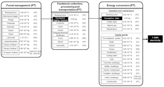 - Dias, A.C. Life cycle assessment of fuel chip production from eucalypt forest residues. Int. J. Life Cycle Assess. 2014, 19, 705–717. [Google Scholar] [CrossRef]