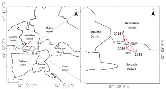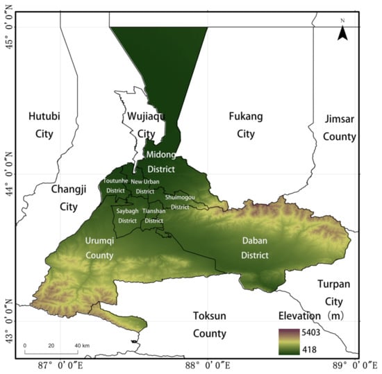 Urumqi (42°45′ to 44°08′ N, 86°37 ′to 88°58′ E) is located in northwestern of China, in the central part of the Xinjiang Uyghur Autonomous Region. It lies at the northern foot of the Tianshan Mountains, south of the Dzungarian Basin. The total land area of Urumqi is 14,216.3 km2, with a population of 3.552 million at the end of 2019, with a GDP exceeding 341.3 billion Yuan []. Urumqi consists of eight districts: Tianshan District, Saybagh District, New Urban District, Toutunhe District, Daban District, Midong District, Shuimogou District and Urumqi County (Figure 1). The local climate type is a temperate continental climate, that is warm and rainy in summer, and cold and dry in winter []. The average annual temperature is 7 °C, the average annual precipitation is 280 mm, and the evaporation is 2730 mm []. Urumqi is an oasis city located in an arid region, and one of the most important rising cities in northwestern China and Central Asia []. Benefiting from the One Belt and One Road policy, Urumqi as important node city, has witnessed rapid economic development [].