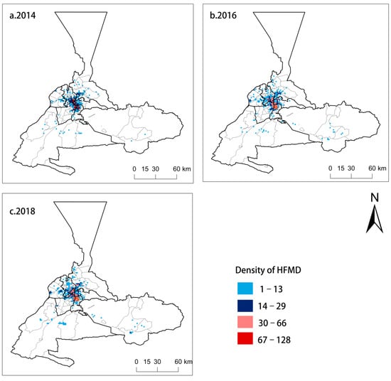 Spatial distribution of HFMD (Hand, foot, and mouth disease) in Urumqi from 2014 to 2018—(a). 2014, (b). 2016, (c). 2018.