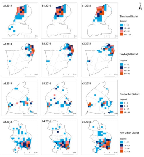 High-density HFMD districts in Urumqi from 2014 to 2018—(a1–a4). 2014, (b1–b4). 2016, (c1–c4). 2018.