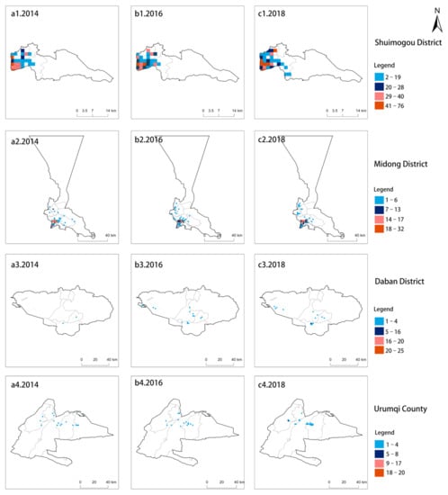 Low-density HFMD districts in Urumqi from 2014 to 2018 ((a1–a4). 2014, (b1–b4). 2016, (c1–c4). 2018).