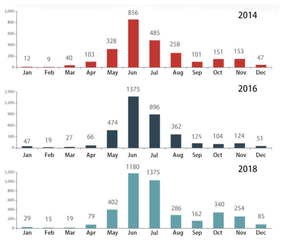 Number of HFMD cases in Urumqi from 2014 to 2018.