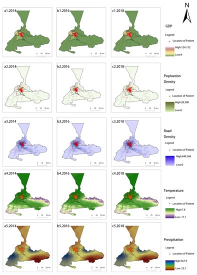 Spatial distributions of HFMD under the influence of different driving factors—(a1–a5). 2014, (b1–b5). 2016, (c1–c5). 2018.