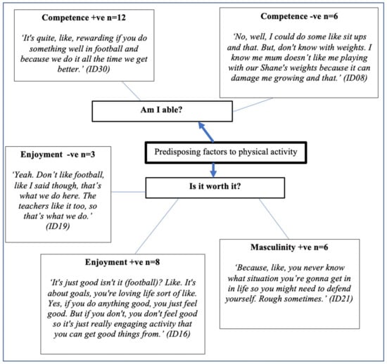 “It’s quite, like, rewarding if you do something well in football and because we do it all the time we get better.” (ID08) and “No. I am not very good at sports and that. I did American football at a summer camp once, but here (school) only does the main sports, like football.” (ID21).