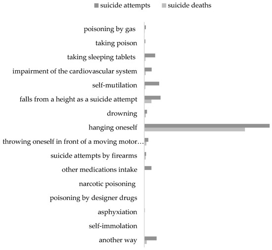 The list of suicide methods in the analyzed period in Poland, broken down into suicide deaths and suicide attempts, is presented in Figure 2.