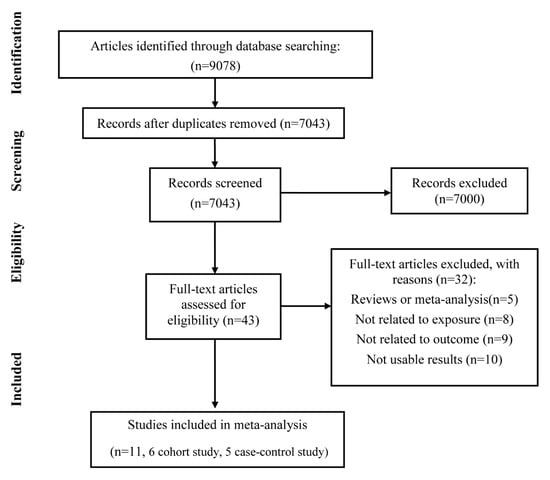 The initial database search yielded 9078 records, with 7043 remaining after the removal of duplicates. Overall, 43 studies were retrieved for full-text assessment by screening titles and abstracts. Furthermore, 32 studies were excluded due to the reasons as follows: reviews or meta-analysis (n = 5), not related to exposure (n = 8), not associated with outcome (n = 9), not usable results (n = 10).
