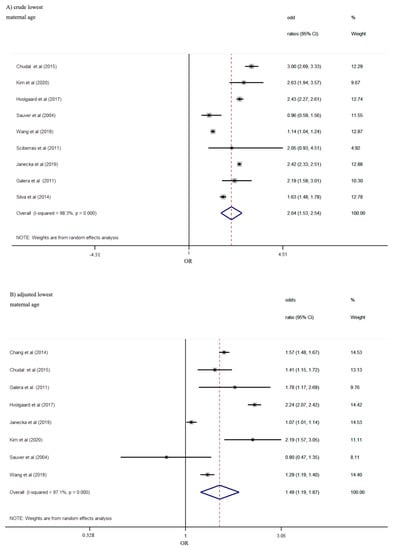 Risk of ADHD according to the lowest maternal age category vs. reference points. Pooled crude effects (A) and adjusted effects (B) for maternal age from random-effects meta-analyses are shown.