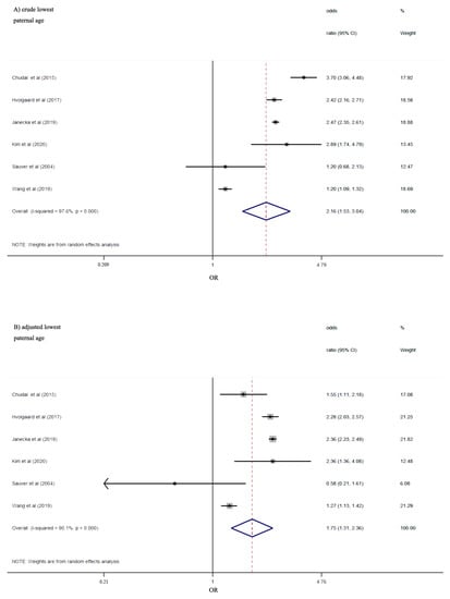 Six studies provided information about the lowest paternal age at delivery and the risk of ADHD in offspring. Similar to the results for maternal lowest age, the pooled estimates comparing lowest paternal age to reference age showed crude ORs of 2.16 (95%CI 1.53–3.04) and adjusted ORs of 1.75 (95%CI 1.31–2.36) (Figure 3), indicating an increased risk of ADHD in offspring. Statistically significant heterogeneity was found both in crude (I2 = 97.6%; p < 0.001) and adjusted (I2 = 95.1%; p < 0.001) estimate.