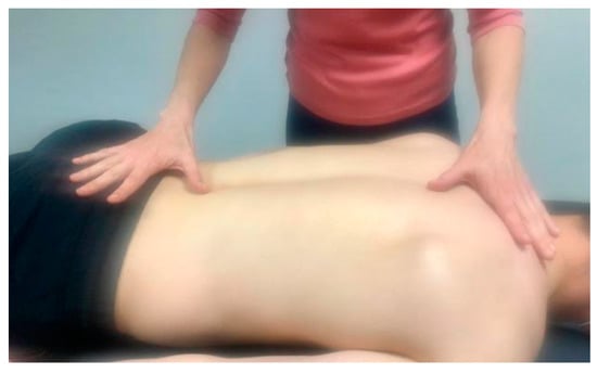 The first level of IMT was applied in this study. The objective is to harmonize the cranial-pelvic system, as this is essential for maintaining a correct posture. The first step consists of balancing the “fuses,” vibration areas that act as a basic protection system for the body. These local spots cease functioning at times, thus resulting in an interruption of the correct SRM: First step, 1st fuse: Inn-trann, (Figure 1) the therapist places her/his index fingertip on the forehead, between the eyebrows, at the base of the glabella. If not balanced, the therapist does the adjustment between spines 4th and 5th sacral vertebrae. A circular movement on the scalp in several very soft circles that shifts from the frontal to the occipital area is performed 6 times (Figure 2). 2nd fuse: 1st dorsal, 4th cervical, 4th dorsal and 3rd lumbar vertebra on the spinous process. To check the one hand is placed on the lumbar vertebrae and the other on dorsal vertebrae (Figure 3). The therapist should notice a subtle synchronic cranio-caudal movement. 3rd fuse: C0 (space between occipital and 1st cervical spinous process), 2nd sacral vertebra and the space between the spinous process of the 2nd and 3rd dorsal vertebrae. One hand is placed on the sacral vertebrae and the other on cervical vertebrae to check the SRM movement. If any point is blocked, it is treated and harmonized with a soft touch towards the occipital.