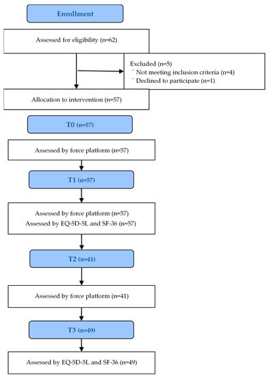 In the force platform assessment, all the individuals performed T0 and T1, and 41 of them performed the T2. All the individuals answered the questionnaires and personal information at T1, and 49 did so at T2 (3-week) (Figure 4). Whether they habitually engaged in any physical activity was recorded.