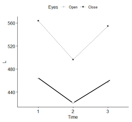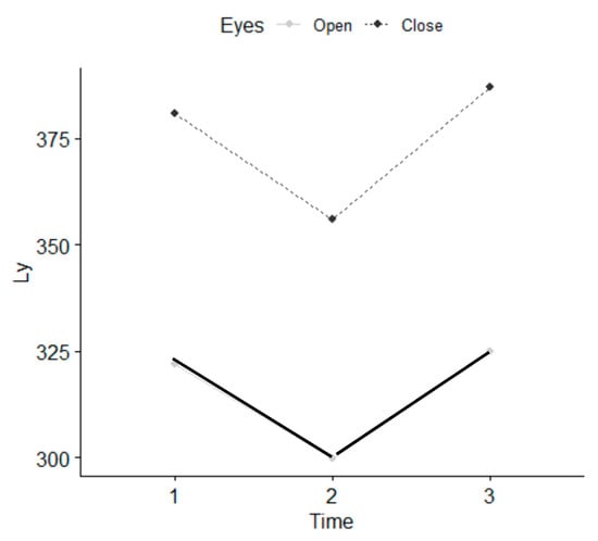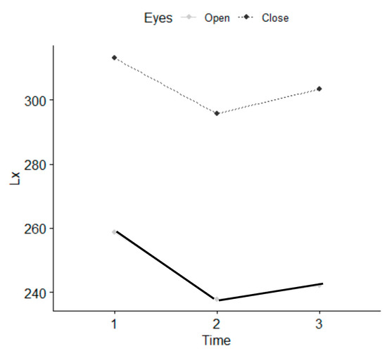 There were no statistically significant differences between the five therapists who performed the intervention. Statistically significant differences were observed in the parameters referring to values of length, such as L, Lx and Ly, with EO and EC, as well as in the parameter stabilometry amplitude in Y with EO at T1 and between T1 and T2 (Table 2) and (Figure 5, Figure 6 and Figure 7). There were statistically significant differences between EO and EC, meaning that individuals fell within the normal range. The age range that improved most was 18–35 years. Women presented a greater balance with EO, in L and Ly parameters than men.