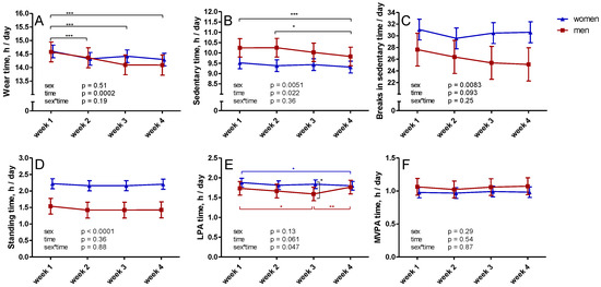 Changes in wear time of the accelerometer (A) and accelerometer-measured sedentary (B) and physical activity time (C–F) during four weeks of data collection. The mean results with 95% confidence interval of women are represented by blue triangles and men by red squares. Note: LPA—light physical activity; MVPA—moderate-to-vigorous physical activity; * p < 0.05; ** p < 0.01; *** p < 0.001.