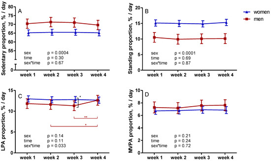 Changes in accelerometer-measured sedentary (A) and physical activity proportions (B–D) during four weeks of data collection. The mean results with 95% confidence interval of women are represented by blue triangles and men by red squares. Note: LPA—light physical activity; MVPA—moderate-to-vigorous physical activity; * p < 0.05; ** p < 0.01.