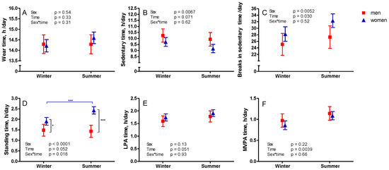 Differences in wear time of the accelerometer (A) and accelerometer-measured sedentary (B) and physical activity time (C–F) during winter (November–March) and summer (April–October). The mean results with 95% confidence interval of women are represented by blue triangles and men by red squares. Note: LPA—light physical activity; MVPA—moderate-to-vigorous physical activity; * p < 0.05; *** p < 0.001.