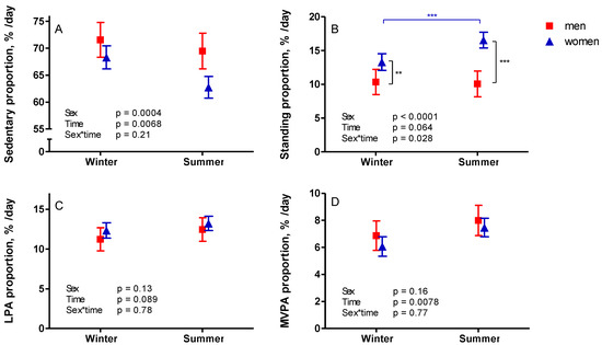 Differences in accelerometer-measured sedentary (A) and physical activity proportions (B–D) during winter (November–March) and summer (April–October). The mean results with 95% confidence interval of women are represented by blue triangles and men by red squares.Note: LPA—light physical activity; MVPA—moderate-to-vigorous physical activity; ** p < 0.01; *** p < 0.001.
