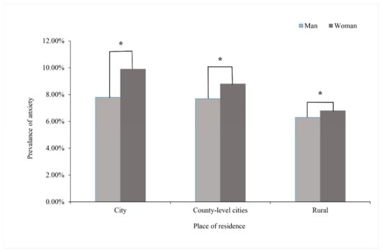 The prevalence of anxiety symptoms in participants by place of residence and men compared with women, * p < 0.05.