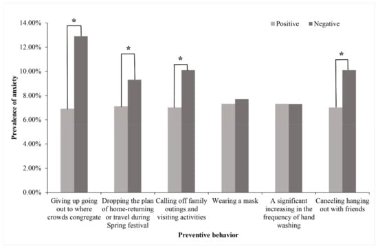 The prevalence of anxiety symptoms classified by preventive behaviors. Performed group compared with not performed group, * p < 0.05.